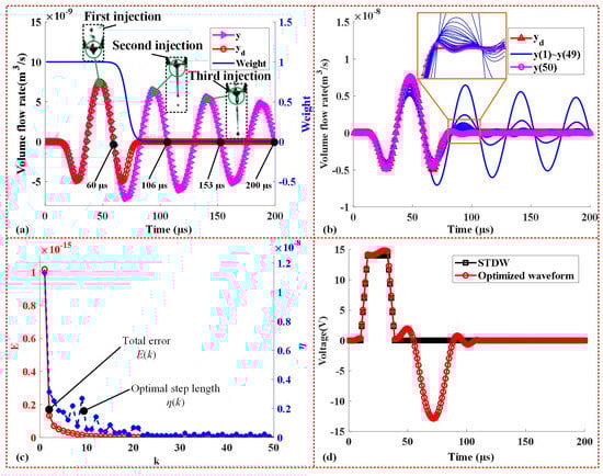The desired injection volume flow rate in Figure 6a is used as the optimization target for iterative learning, and the iterative algorithms are started. Figure 6b shows the injection volume flow rate (solid blue lines) of each iteration step in the iterative learning process, the results show that as the iterations increase, the injection volume flow rate keeps approaching the optimization target, and at the 50th iteration step, the residual peak has been well suppressed (as shown by the magenta circle line in Figure 6b). Figure 6c shows the change in total error, E(k), and iteration step length, η(k), with the iterations. The results show that the total error in the iteration process is strictly convergent (it can be seen from the figure that the total error, E(k), basically converges after 10 iterations, which shows that the iterative algorithm has fast convergence characteristics and can improve the real-time performance of the controller), and the optimal iteration step length is automatically calculated according to the error. Figure 6d shows the optimized drive waveform. Compared with the STDW, the optimized drive waveform has a new negative voltage pulse, which is mainly used to suppress the residual pressure vibrations.
