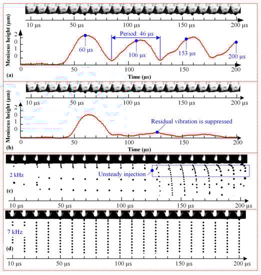 The experimental system described in Section 4.1 is used to verify the actual effects of suppressing residual vibrations. Figure 7a shows the meniscus vibration in the ethanol when the STDW is used. The results show that the vibration period of the meniscus is about 46 μs, and the volume is the largest at around 60, 106, 153, and 200 μs, respectively. This is highly consistent with the prediction results in Figure 6a, which proves that the model established in this study has high accuracy. Figure 7b shows the vibration in the meniscus when the optimized drive waveform is used. The results indicate that the optimized drive waveform presented can effectively suppress the residual vibrations. Moreover, when the STDW is used for MJ-AL-80 PPH, and the frequency is higher than 1 kHz, an unstable ejection phenomenon will occur (as shown in Figure 7c). When the optimized drive waveform is used, the droplet ejection process is still stable at the frequency of 7 kHz (as shown in Figure 7d). This shows that the optimized waveform can significantly improve the droplet ejection frequency.
