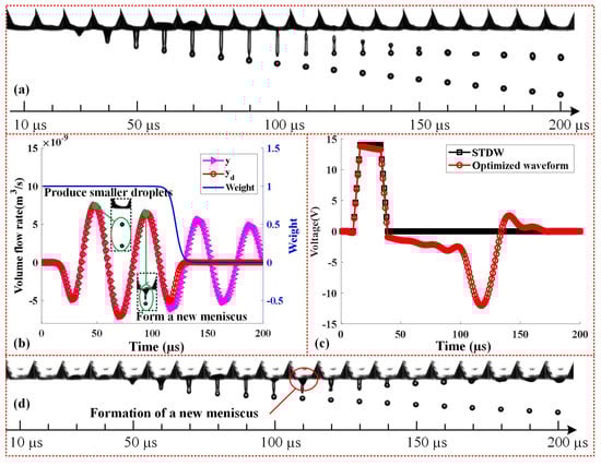 Typically, a droplet produced with the PPH has the same diameter as that of the nozzle. However, some special drive waveforms can be used to reduce the droplet diameter without reducing the nozzle diameter. These drive waveforms produce smaller drops by forming a tongue on the meniscus [11]. However, it is difficult to produce smaller droplets when the viscosity of the fluid is too low [12]. This is because it is difficult for low-viscosity fluids to form a stable tongue on the meniscus. However, as shown in Figure 8a, increasing the drive force of a low-viscosity fluid can produce multiple smaller droplets, and the second smaller droplet is clearly formed by trailing tails. One way to eliminate the second/following droplet is to create a new meniscus that pulls the tail back inside the nozzle. To create a new meniscus at the nozzle after the main droplet is formed, the volume flow rate with two volume flow rate peaks shown in Figure 8b is used. The first peak is used to produce smaller droplets, and the second peak is used to form a new meniscus at the nozzle to pull the tail back inside the PPH. Similar to the reference volume flow rate to suppress residual pressure vibration, to ensure the accuracy of calculation, the discretization period of this process is 1 μs. The volume flow rate in Figure 8b is used for iterative learning. Similar to Figure 6, the optimized waveform shown in Figure 8c can be obtained using iterative learning. Figure 8d shows the formation of smaller droplets when the optimized waveform in Figure 8c is used. When the main droplet breaks, a new meniscus is formed to pull the tail back inside the nozzle. The diameter of the PPH nozzle is 80 µm and that of the smaller droplet is approximately 26 µm. The droplet diameter decreases by 67.5%.