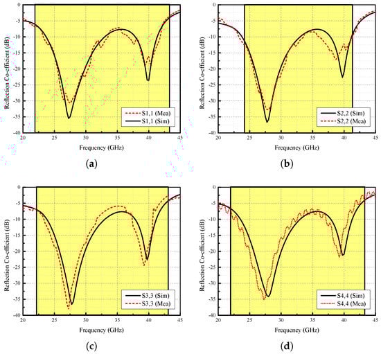 The antenna is so thin and flexible that it requires a delicate mechanical balance to keep steady during the measurement. It is seen from the plots in Figure 10a–d that the measurement and simulated reflection coefficients are in great agreement. The slight shifts in the pole locations are due to slight bends of the substrate and also they are well within measurement uncertainty. Figure 10e shows the simulated and measured ports isolation performance between the antenna elements on the array. The slight difference between simulations and measurements can be attributed to the aforementioned calibration and bend issues. However, an isolation performance of at least 20 dB is achieved as seen in the figure. The measured isolation value is obtained as 24 dB at 28 GHz and 37 dB at 38 GHz.