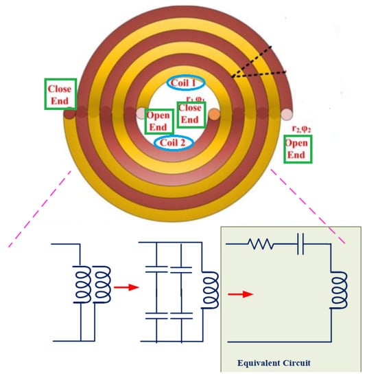 In [30], a self-resonant Archimedean open bifilar spiral-coil system employed both in Tx and Rx sides was presented. In comparison with the conventional copper/Litz conductor, that topology was shown to provide a high power-transfer efficiency [30]. Figure 7 depicts the structure of the Bifilar coil together with its equivalent circuit model.