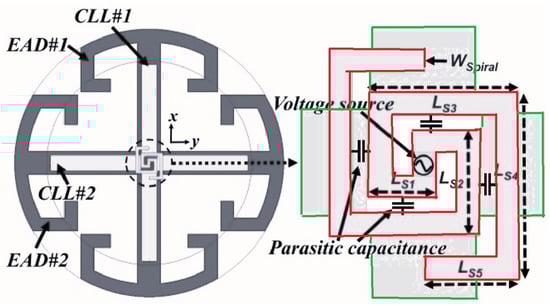 In another study, small Huygens circularly polarized (HCP) rectenna (rectifying antenna) was presented in [34], where the rectifying circuit was integrated directly into the antenna. It also operates at 915 MHz and is highly capacitive. Figure 11 presents the general structure of the HCP antenna where the system includes an inductive input impedance. Additionally, a planar Huygens dipole rectenna was developed in [35] for WPT applications achieving a high gain (4.6 dBi).
