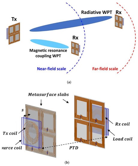 Lee et al. presented a metasurface-based multi-scale WPT that can work at 6.78 MHz in the near-field and at 433 MHz in the far-field regions [37]. Figure 13a depicts the concept of the developed metasurface WPT that is operating both at near- and far-fields whereas its structure is shown in Figure 13b. Compared to a no-slab case, the achieved power transfer efficiency was increased up to 50.1% with the metasurface slabs.