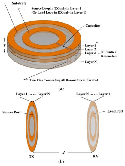 The planar multilayer elements SCMR WPT system developed in [16]; (a) geometry of the Tx and Rx elements, (b) general configuration of multilayer system.