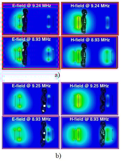 In [10], a methodology for the design of 10 MHz planar magnetically coupled resonant WPT systems was introduced with aim to design a a well-matched system with a maximized power-transfer efficiency for mid-range applications. A detailed dosimetric study was performed using a detailed high-resolution anatomical human body voxel model to evaluate the exposure levels with respect to the ICNIRP basic restrictions considering , , and specific absorption rate (SAR) (local and whole body averaged SAR) as exposure metrics. Figure 16 depicts the distributions of the electric and magnetic fields inside the body for different locations of the body between the Tx and Rx coils.