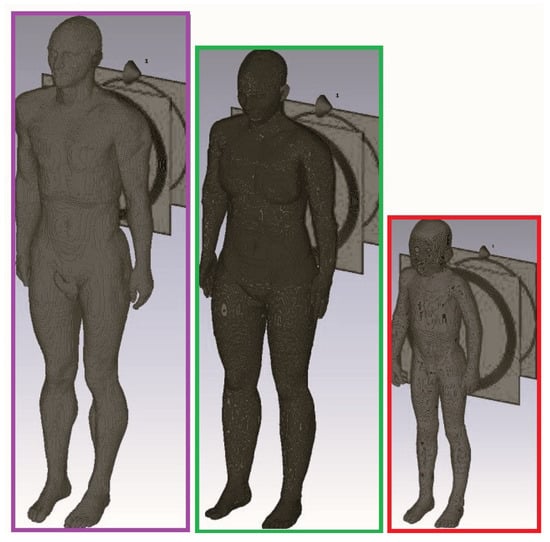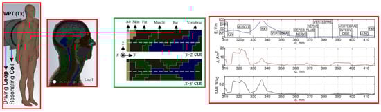In [41], a dosimetric study was conducted with the aim to compare the exposure levels among children and adults when exposed to a 10 MHz resonant WPT (Figure 18). The exposure levels with respect to the ICNIRP basic restrictions were evaluated in terms of dosimetric quantities (, , and local and whole body SAR).