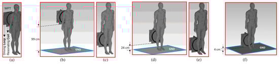 Tx part of a 10 MHz WPT system in proximity to a grounded and ungrounded Duke model at different locations with respect to the ground: (a,c,e) ungrounded, (b,d,f) grounded.
