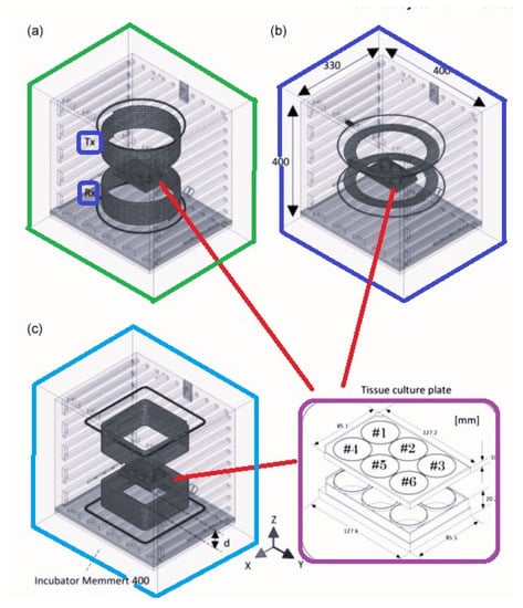 In [43], an exposure system for in vitro studies was designed to emulate the exposure of a monolayer of cells to a 13.56 MHz WPT system, aiming at maximizing the SAR uniformity on the plane where the layer is cultured, as well as SAR efficiency (defined as SAR over the input power) within the size constraints of a standard incubator (Figure 20). The concluding contributions of that study are summarized in Table 2.