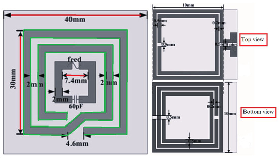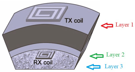 Last but not the leastm with the aim to reduce the overall size of the WPT system, Bao et al. presented a planar multilayer elements SCMR WPT system [16]; its general structure is shown in Figure 15. Their results show that for the targeted efficiency is obtained with a 50% area reduction.