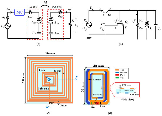In [28], a closed-loop transmitter was designed to achieve a high power transfer efficiency. The designed Tx includes a source oscillator, power amplifier (PA), with its driver, matching network, and feedback circuitry (Figure 5). For highly efficient WPT systems, asymmetric coil structures were reported in [29]. Figure 6 shows the optimized coil structure including the three-turn spiral coil; details can be found in Table 1.