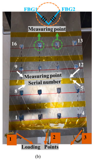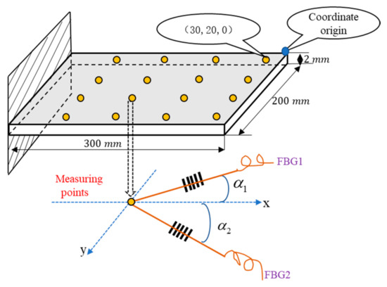 The layout of the FBG sensor can follow the optimization algorithm, such as the particle-swarm algorithm (PSO), considering the small area of the test piece and the force distribution in Figure 1, the system adopts the uniform distribution method to tile measuring points, a total of 16 measuring points, which is a combination of 4 rows ×4 columns. The distance of each row is 50 mm, the distance of each column is also 50 mm, the long side of the test piece is the x-axis, the width of the y-axis, the blue dot is the coordinate origin, and the coordinate of the nearest grating measuring point to the coordinate origin is (30, 20, 0).