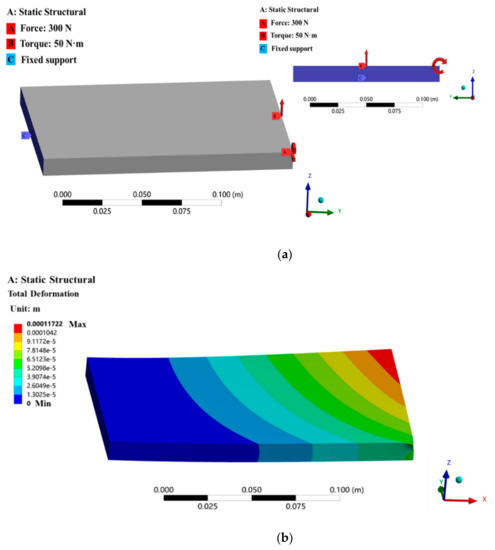 For the structure of the test piece shown in Figure 1, the system simulation model shown in Figure 2a is established by the workbench module of the Ansys finite element software version 2022 to simulate the strain values and deformation variables of each measuring point on the test piece under different loads. The parametric method in the workbench is used to simulate the deformation and strain of the test piece under different loads. The input parameters are the value and the loading point of the load on the test piece, while the output parameters are the strain values and deformation variables in the x, y, and z directions of 16 measuring points on the test piece.