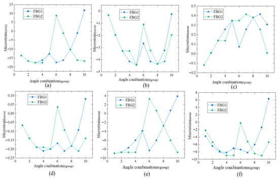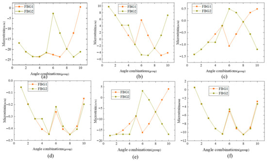 Double FBG strain variation diagram of measuring point 1: (a) Load loading mode 1; (b) Load loading mode 2; (c) Load loading mode 3; (d) Load loading mode 4; (e) Load loading mode 5; (f) Load loading mode 6.