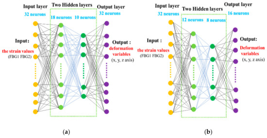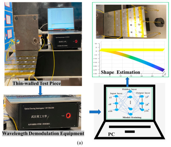Machine learning has become one of the most efficient tools for complex problems through the promotion of big data [22,23,24,25,26,27,28,29]. The organic integration of data-driven and optical fiber-sensing technology alleviates the constraints brought by the economy and the technology and also minimizes the impacts of unknown factors to a certain extent. A neural network is one of the more widely used machine learning methods, and neural networks are more widely used in deformation perception; for example, the predicting of slope displacements with neural networks [30,31] and predicting widespread stomach deformation with neural networks [32]. Sefati, S et al. used sensory data from unmodeled uncalibrated sensors embedded in a continuum manipulator (CM) to estimate the shape and distal-end position estimation (DPE), studied three data-driven models, and compared DPE and shape-reconstruction results. The proposed neural network approach avoids the accumulation of integration errors in traditional methods and produced more accurate DPE [33]. Zheng, HR et al. demonstrated a kind of optical fiber shape sensing algorithm based on an artificial neural network, which provides improved accuracy, has better robustness, and has less time delay. The algorithm shows great potential for applications in high-precision real-time fiber-shape measurement [34]. Manavi, S et al. trained a neural network with supervised deep learning to extract shape information directly from Edge-FBG spectra and predicted the shape of a fiber optic sensor consisting of five edge-FBG triads by the network model. The tip error is less than 6 mm [35]. Baldwin, CS et al. used the strain of the structure to determine the deformation of the wing structure (cantilever plate). The experiment proved that the neural network approach performed best when trained using experimentally measured strain and deformation data [36]. Wu, XY et al. proposed a PSO-RR (particle swarm optimization-ridge regression) algorithm for structural deformation monitoring and reconstruction of a wing under different loading conditions. Compared with the KO theoretical results, the method is highly accurate and does not depend on the specific structure [37]. Wu, HF et al. proposed a method based on FBG and neural networks for flexible-structure deformation monitoring and shape reconstruction. The experimental results showed that the prediction results were highly consistent with the expected effect [38]. The above research shows the advantages of neural networks for deformation monitoring, especially the combination of neural networks and finite elements [39]. Neural networks also have many advantages for monitoring the deformation of thin-walled plates, though, in this area of application, the literature is not common at present.