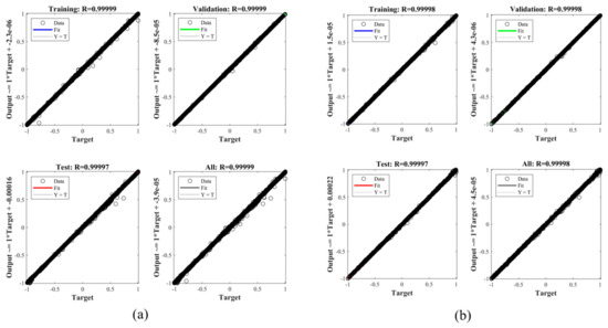 Correlation analysis of the model: (a) R2 of the x- and y-axis; (b) R2 of the z-axis.