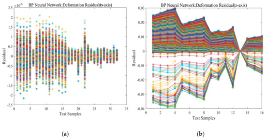 The model residual is the difference between the predicted value and the actual value. From Figure 11a, it can be found that the residuals of measuring point four and measuring point eight are the largest in the x- and y-axis, though the maximum residual is <2.5 × 10−8 m, which is within the acceptable range; in Figure 11b, the residual of measuring point 13 is almost zero, which means that the predicted value of measuring point 13 is the most accurate, and the residual of measuring point four is larger, with a value range of (−0.04 m–0.03 m), which is also within the acceptable range.