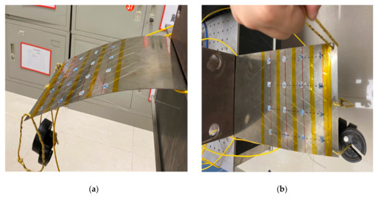 In this paper, the authors are talking about flexible thin-walled structures, mainly similar to wind-turbine blades, solar panels, aircraft wings, helicopter blades, other flexible structures, and so on. That is, one end is fixed and the other end moves freely. The stainless-steel plate of 300 mm (length) × 200 mm (width) × 2 mm (height) is selected as the test piece for the flexible thin-walled structure in this system, as shown in Figure 1. The purpose is to verify the use of a data-driven mode for deformation sensing, which can simplify the impact of measurement due to uncertainties such as irregular shape and complex forces.