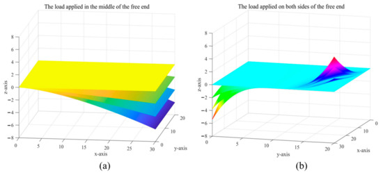 (2) The reconstruction error of the measuring points in the x y-axis direction is very much related to the selection of the coordinate origin, which is a relative error, and is not consistent with the measurement error of the form variable of the measuring points in the XY direction. Further, the deformation of the measurement points in the x- and y-axis direction is small and has limited impact on the shape reconstruction of the thin plate, so the relative error in the x- and y-axis direction can be used to verify whether the accuracy of the upgraded reconstruction method is improved.