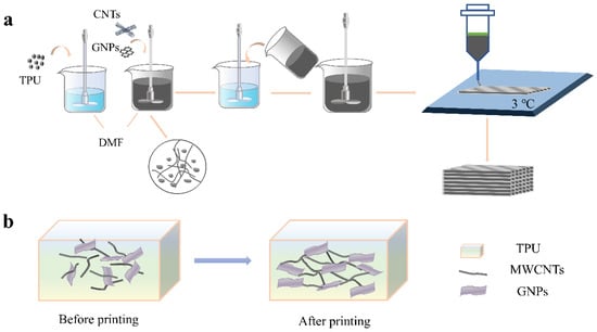 Firstly, MWCNTs and GNPs were dispersed in DMF under mechanical stirring to form a uniformly dispersed suspension. Next, the TPU particles were completely dissolved in the DMF solvent by use of mechanical stirring. Then, the suspension was gradually added to the TPU solution and mechanical stirring was continued for more than 6 h. Next, the solution was poured into a Petri dish and placed in a fume hood to evaporate the solvent, and then the obtained viscous ink was stirred in a planetary gravity stirrer (2000 rpm, 1.0 KPa) for 4 min to remove the generated air bubbles, and finally the inks for DIW printing were obtained. The ink used for printing needs to have the characteristic of shear thinning. Shear thinning is the non-Newtonian behavior of a fluid in which the viscosity decreases as the shear rate increases. As a result, even at lower extrusion pressures, it aids the ink to flow through the nozzle, ensuring extrudability.
