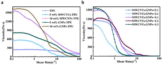 Rheological properties of different components and different filling proportions of ink. (a) Viscosity curves of TPU inks filled with pure TPU and single component fillers. (b) Viscosity curves of composite inks at room temperature using a total of 10 wt% fillers with different proportions of MWCNTs and GNPs fillers (MWCNTs:GNPs = (3:1, 2:1, 1:1, 1:2, 1:3)).