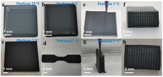 Printing 20 mm × 20 mm × 1 mm samples with temperatures at (a) 25 °C and (b) 3 °C; (c) 40 mm × 40 mm grid samples and (d) dumbbell shape samples formed at 3 °C; (e) 20 mm × 20 mm × 10 mm samples in the printing process and (f) after completed printing; (g) the printing process and (h) the printed sample of 4 mm × 20 mm × 12 mm. The above applied inks are all 10 wt% GNPs-TPU.