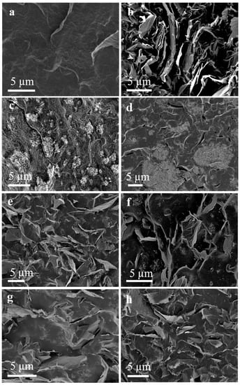 SEM cross-sections of TPU composites. DIW forming sample: (a) Pure TPU; (b) 10 wt% GNPs-TPU; (c) 10 wt% MWCNTs-TPU; (d) mold forming of 10wt% (MWCNTs:GNPS = 1:2)-TPU; DIW forming sample: (e) 10 wt% (MWCNTs:GNPs = 3:1)-TPU; (f) 10 wt% (MWCNTs:GNPs = 2:1)-TPU; (g) 10 wt% (MWCNTs:GNPs = 1:1)-TPU; (h) 10 wt% (CNTs:GNPs = 1:2)-TPU.