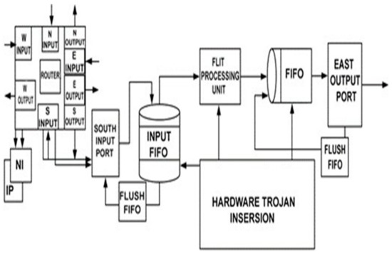 The proposed method aims to detect and mitigate HTs that are embedded in the NoC at the various stages of design and fabrication. These HTs maliciously modify the type, destination, and integrity of a flit, so the proposed method is designed to detect and mitigate these HTs. These attacks will deplete bandwidth and are strongly considered in this study. The study assumes that the links of the NoC routers are to be trusted (which is guaranteed by a method presented in [38]). Because of the large area accessed by the first in first out (FIFOs) it is believed that the FIFO is more easily compromised than a submodule of the router, such as a flit processing unit. The hardware Trojan can be inserted into different parts of the network, such as the flit processing unit, the input FIFO, and FIFO. The flit processing unit is where a basic operation is performed on the flit; these operations are described below. The input FIFO is the first unit to process these flits and FIFO is used to transfer the flit through its east output port to the other routers. These units are described in Figure 5.