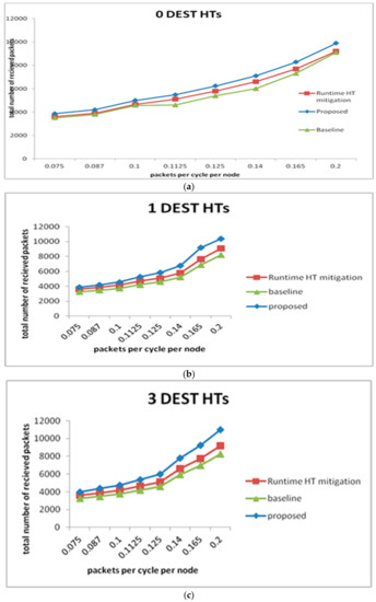 In the case of head HTs, the runtime HT mitigation method has less effect on preventing the head HT, compared to our technique. As can be seen in Figure 11b, the runtime HT mitigation method receives a fewer number of packets than the baseline NoC does in situations where there is no HT.