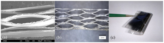 (a,b). SEM and optical microscope image of cross-section of the honeycomb structure; (c). Photograph of prepared flexible COC piezoelectric sensor (4 layers of COC film).