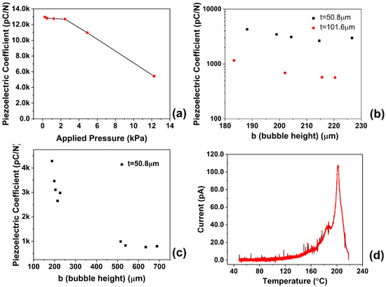 (a). Quasistatic piezoelectric coefficient of prepared piezoelectric foam (b = 240 μm, t = 50.8 μm); (b). Foam wall thickness’s effect on the sensitivity of the material; the d33 value was under a pressure of 4.9 kPa; (c). Artificial void height’s effect on the sensitivity of the material; (d). Thermally stimulated discharge of prepared piezoelectric foam (b = 240 μm, t = 50.8 μm).