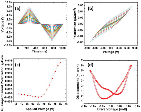 To study the surface charge build-up process in the artificial void, an electric hysteresis loop test was used. The sample used in this characterization had a bubble thickness of 240 µm. Bipolar charging voltages from 500 V to 8000 V were applied during the hysteresis loop test. The characterization equipment used for the hysteresis loop and voltage–displacement butterfly hysteresis loop (butterfly loop) was the TREK model 609B and RADIANT Precision Premier II. The butterfly loop, which can characterize the material actuation behavior, was also measured with the electric hysteresis loop testing equipment. The samples were supplied with a bipolar drive voltage with a maximum value of 8000 V. The small deformations of the material were then measured with a high-precision optical fiber system (TF Analyzer 2000 system).
