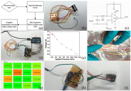 (a). Illustration of design of the pressure-sensing and mapping device based on COC piezoelectric materials; (b). Piezoelectric sensor signal-conditioning circuit converts high-impedance signals to low-impedance signals; (c). Voltage–pressure relationship of COC piezoelectric foam as the pressure-sensing result; (d). Photograph of the piezoelectric foam sensor array with 4 × 4 sensor for demonstration purposes; (e). Layout of the multipoint pressure-sensing device based on COC piezoelectric materials; (f,g). Demonstration of multi-point tactile-sensing capability of the material; (h). Demonstration of the capability of piezoelectric foam as flexible biosignal-measuring sensor; (i). A compact design of the sensing circuit demonstrated the wearable, low-cost, low-power-consumption pressure-sensing capability of the piezoelectric foam.