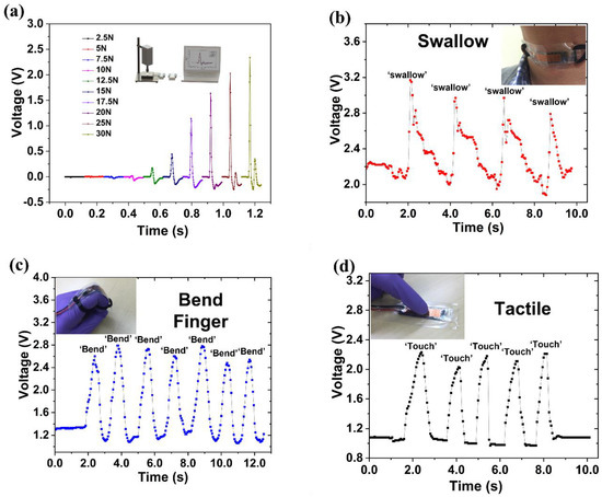 We next demonstrated the capability of the sensors to detect a variety of movements/motions encountered in many applications. Figure 5a illustrates the sensor response to impact forces. An impact tester was used to repeatedly strike the sensor with forces of different magnitude. The sensor performed well in detecting the impact events by almost instantaneously outputting sharp signal peaks of different magnitudes in real time. The sensor was also used to detect the movement of body parts. Figure 5b shows the sensor attached to a tester’s neck to monitor the swallow event of the person. As the tester swallowed, a signal was generated by the sensor with an instantaneous response. Figure 5c shows the detection of finger bending, which was well captured by the sensor. Figure 5d demonstrates the tactile-sensing capability of the sensor. Again, it performed well.