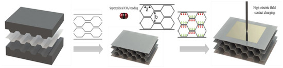 Figure 6 also illustrates the fabrication procedure of the COC piezoelectric foam. The overall process can be divided into two stages: the fabrication of the honeycomb structure and charging. The fabrication process of the honeycomb structure can also be divided into two steps: the preparation of the corrugated polymer film and the assembly of the honeycomb structure.