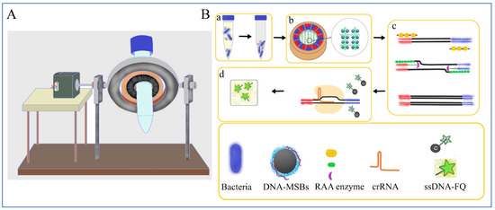 (A) The setup of the lab-on-a-tube biosensor; (B) the schematic of this lab-on-a-tube biosensor. (a) The yellow color and the pink color represent the milk sample and protease K with lysis buffer, respectively; (b) the relative position of MSBs and the iron wire netting; (c) the schematic diagram of RAA; (d) the schematic diagram of Cas12a-crRNA-target DNA complex active non-specific cleavage.