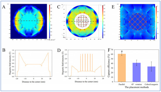 Magnetic field simulation and capture efficiency. (A) Simulation of magnetic field intensity within a Halbach cylinder magnet. (B) Magnetic field intensity along the horizontal line. Simulation of magnetic field intensity of the iron wire netting inside a Halbach cylinder magnet at parallel (C) and at 45° (E) using the placement methods. (D) Magnetic field intensity along the horizontal line. (F) Capture efficiency of the two placement methods and two cuboid magnets (N = 3). * indicates significant difference at p < 0.05.