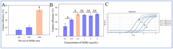Optimization on amount and size of MSBs. (A) Capture efficiency for different sizes of MSBs (N = 3). (B) Capture efficiency for different concentrations of MSBs (N = 3). (C) Real-time qPCR results of DNA extracted from different concentrations of samples using the biosensor (N = 3). * indicates significant difference at p < 0.05. “NS” indicates no significant differences.