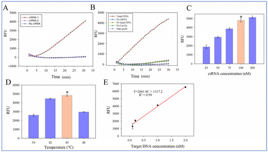 Optimization of the RAA-CRISPR/Cas12a assay. (A) Fluorescent intensity results for different crRNAs (N = 3). (B) Fluorescent intensity results of the RAA-CRISPR/Cas12a assay with missing elements (N = 3). (C) Fluorescent intensity results for different concentrations of crRNAs (N = 3). (D) Fluorescent intensity results for different CRISPR reaction temperatures (N = 3). (E) The calibration curve of the biosensor for synthetic fragments (N = 3). * indicates significant difference at p < 0.05.