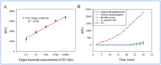 The specificity of this biosensor was evaluated using Salmonella Typhimurium at 8.7 × 102 CFU/mL as the target bacteria; Listeria monocytogenes, Bacillus cereus, and E. coli O157:H7 at 104 CFU/mL as the non-target bacteria, and deionized water as the negative control (NC). As shown in Figure 5B, it is clear that the fluorescent intensity of the target bacteria is significantly higher than those of non-target bacteria, showing the good specificity of the biosensor. The specificity of the RAA-CRISPR/Cas12a system relies on the crRNA. Mismatches between the crRNA and its target sequence could impair the cleavage activity of the CRISPR/Cas12a complex, which makes CRISPR/Cas12a-based detection assays highly specific. All the pretreatments were conducted in the tube to avoid DNA contamination and, hence, avoided false positives.