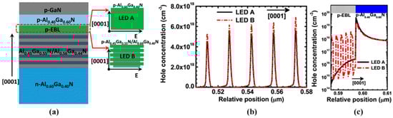 According to the reports of different research groups, the hole concentration distribution at different positions in the quantum wells for DUV LEDs is different [42,45,48,51,52,53,54,55]. Some of these reports showed that holes were usually clustered in the last quantum well nearest to the p-EBL [45,48,51,53]. In addition, the energy band bias ratio between the different conduction band biases and valence band biases would seriously affect the hole transport in the active region. The energy band bias ratio often mentioned in some reports included 50/50 [45,48,51], 65/35 [42,52] and 70/30 [53,54]. Compared with InGaN/GaN-based visible LEDs, the hole distribution in the active region of AlGaN-based DUV LEDs was shown to be more uniform [45,48,51]. Therefore, we should focus on improving the hole concentration level in each quantum well, rather than studying the hole concentration distribution uniformity in the active region for DUV LEDs [56].
