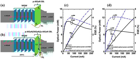 In addition to some of the methods mentioned above, reducing the thickness of the p-EBL layer can also enhance the hole intraband tunneling efficiency, thus, improving the hole injection [47]. In general, thick p-EBLs result in the intraband tunneling for holes being more difficult. According to a report by Zhang et al., through inserting a very thin layer of AlGaN into a p-EBL, the thermionic emission and intraband tunneling process can be obtained simultaneously in the hole transmission process, reducing the valence band barrier for layer L1 (the p-EBL layer near the side of the quantum barrier), thus, being beneficial for improving the hole injection efficiency [48]. As shown in Figure 2, the experimental and calculated results showed the same trend. Recently, Liu et al. studied the hole injection at the last quantum barrier (LQB) and p-EBL interface. By inserting an Al-composition-increasing AlGaN layer (ACI-AlGaN) between the LQB and p-EBL, the effective barrier height of holes could be reduced, and the hole accumulation could be induced in the vicinity of the n-side interface of the p-EBL, so as to promote hole injection and improve the EQE and optical power of the DUV LEDs [49].