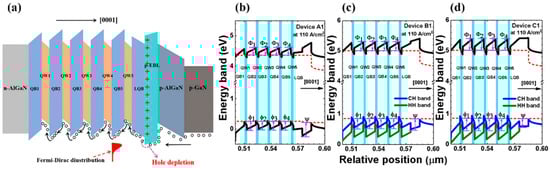(a) Schematic energy band diagram for investigated DUV LED structures which were grown along the [0001] orientation. Polarization-induced positive charges were generated at the LQB/p-EBL interface. Energy band diagrams in the vicinity of the active region, the p-EBL and the partial p-AlGaN layer for (b) device A1, (c) device B1 and (d) device C1 at an injection current density of 110 A/cm2. Reproduced from Ref. [50] with permission from AIP Publishing.