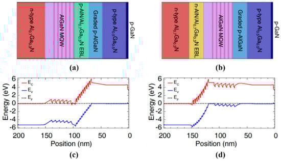- Pandey, A.; Shin, W.J.; Liu, X.; Mi, Z. Effect of electron blocking layer on the efficiency of AlGaN mid-ultraviolet light emitting diodes. Opt. Express 2019, 27, A738–A745. [Google Scholar] [CrossRef] [PubMed]