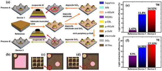 (a) Process flow charts for DUV LEDs with inclined sidewalls (process A) and the proposed inclined sidewalls with laterally overetched p-GaN layer (process B). (b–d) Top views for reference: device 1 and device 2 under optical microscope. LEEs for (e) TM- and (f) TE-polarized light for reference device: devices 1 and 2. Reproduced from Ref. [92] with permission from the Optical Society of America.