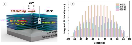 (a) Schematic diagram for the structure and fabrication of AlGaN-based NP-DBRs. (b) Full spatial TE/TM mode light intensity distributions in the Wi-D and Wo-D regions. Reproduced from Ref. [107] with permission from the American Chemical Society.