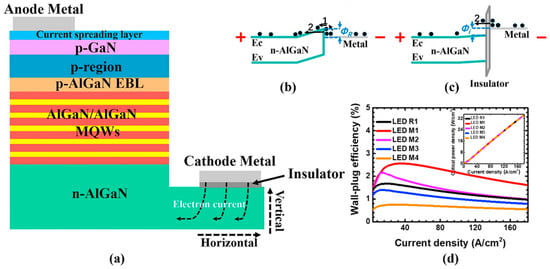 In addition, Shao et al. improved the WPE of AlGaN-based DUV LEDs and reduced the contact resistance by adopting the metal–insulator–semiconductor (MIS) structure on the n-AlGaN layer [113]. As shown in Figure 9, the MIS structure can make the electron affinity band of a cathode metal higher than the conduction band of the n-AlGaN layer, which is conducive to the intraband tunneling effect of electrons. At the same time, the effects of the relative dielectric constant, the band gap, the affinity, the length and the thickness for the insulator, as well as the metal electron affinity on the electronic transport and the WPE of DUV LEDs were also studied. The results showed that using the MIS structure could significantly reduce the influence of cathode metal electron affinity on the WPE. If the relative dielectric constant of the insulator decreased, the WPE of DUV LEDs would increase.