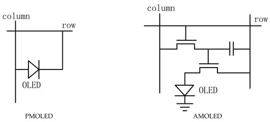 OLEDs (organic light-emitting diodes) have gained widespread attention for their advantages such as low power consumption, high contrast, fast response time, thinner, and more foldable characteristics. According to the different driving methods, OLED driving technology can be divided into PMOLEDs (passive-matrix OLEDs) and AMOLED (active-matrix OLEDs). PMOLED has the advantages of a simple structure and low cost. However, PMOLED requires a larger driving voltage, and its power consumption is significantly higher than the AMOLED. As shown in Figure 1, AMOLEDs use independent thin-film transistors to control each pixel, so that each pixel can be continuously and independently driven and lit. Therefore, AMOLED is suitable for large and high-resolution displays, and has high application prospects for the displays [1,2,3,4].