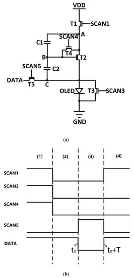 The circuit structure and the driving schematic diagram are shown in Figure 2. As shown in Figure 2a, the circuit consists of one driving TFT (T2), four switching TFTs (T1, T3, T4, T5), and two capacitors (C1, C2).