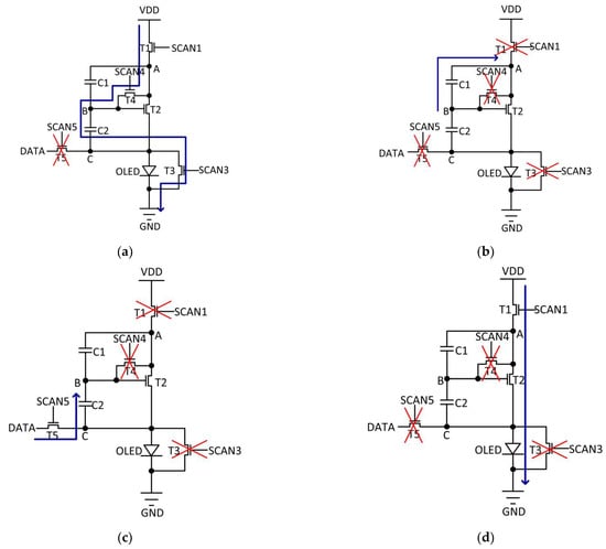 In the initialization stage, as shown in Figure 2b, SCAN1, SCAN3, and SCAN4 are high. SCAN5 is low. Therefore, T1, T3, and T4 are turned on. T5 is turned off. The schematic of the circuit in this stage is shown in Figure 3a.