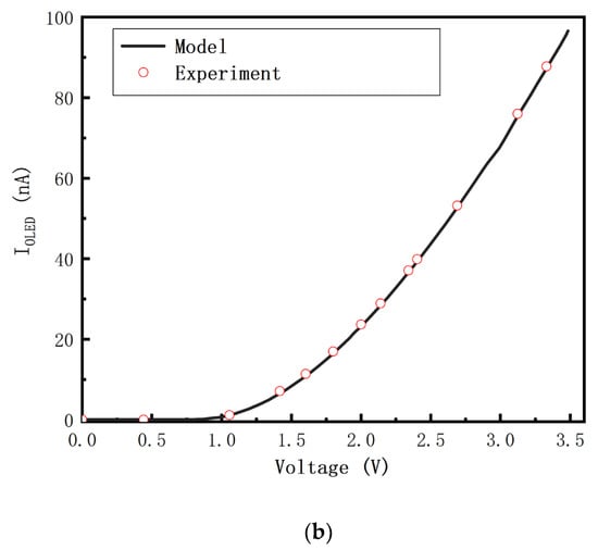 In the circuit simulation, to evaluate the compensation performance, the SPICE model (level = 35) is used for the oxide TFTs. The TFTs’ threshold voltage and mobility are 1.5 V and 50 cm2/V, respectively. The TFTs’ threshold voltage variation and mobility variation are ±0.5 V and ±30%, respectively [9,14,28]. The OLED model is equivalent to a TFT and a COLED in parallel [22,27,32]. The oxide TFT and the OLED models are verified by the experimental data [8,33], which are shown in Figure 4.